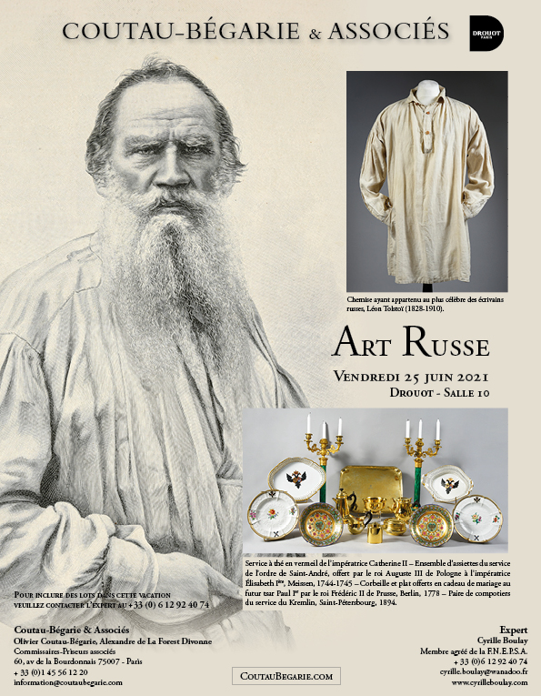 par Cyrille Boulet, expert membre de la FNEPSA et de la CEDEA Couteau-Bégarie & Associés Chemise ayant appartenu au plus célèbre des écrivains russes Léon Tolstoï (1828-1910) — Service à thé en vermeil de l'Impératrice Catherine II — Ensemble d'assièttes du service de l'ordre de Saint-André, offert par le roi Auguste III de Pologne à l'Impératrice Elisabeth Ière, Meissen, 1744-1745 — Corbeille et plats offerts en cadeau de mariage au futur tsar Paul Ier par le roi Frédéric II de Prusse, Berlin, 1778 — Paire de compotiers du service du Kremlin, Saint-Pétersbourg, 1894. Je reste à votre disposition pour tous renseignements. Avec mon cordial souvenir. Cyrille Boulay