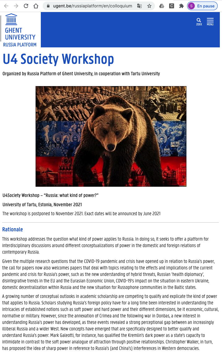The workshop coordinators are Andrey Makarychev (Tartu University) and Fabienne Bossuyt (Ghent University). Organized by Russia Platform of Ghent University, in cooperation with Tartu University The workshop is postponed to November 2021. Exact dates will be announced by June 2021. Rationale This workshop addresses the question what kind of power applies to Russia. In doing so, it seeks to offer a platform for interdisciplinary discussions around different conceptualizations of power in the domestic and foreign relations of contemporary Russia.