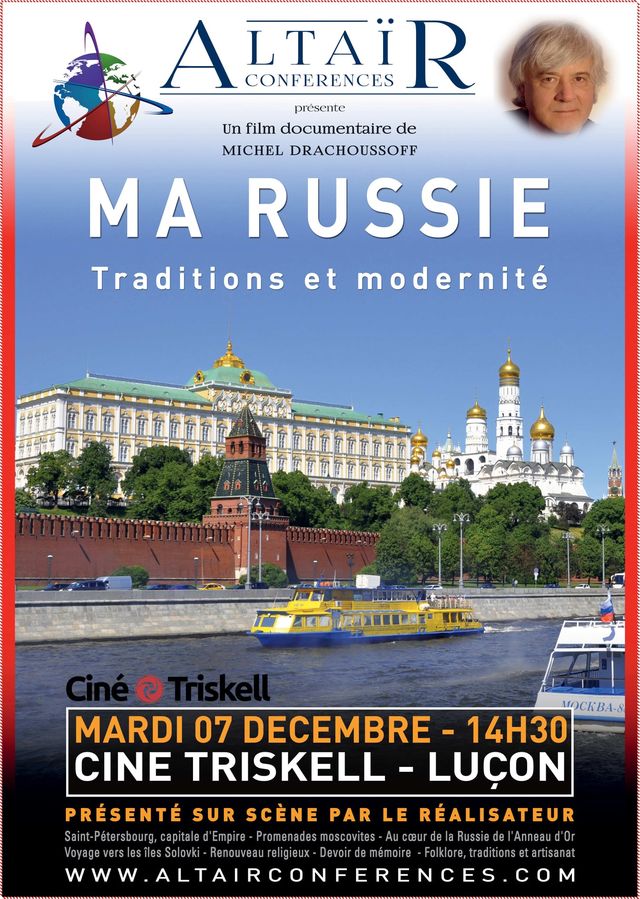 Un film documentaire de Michel Drachoussoff Début de ma tournée en Bretagne-Val de Loire dès lundi 22 novembre prochain. Si vous avez des amis passionnés de culture russe ou de voyage dans ce pays resté mystérieux à bien des égards, merci de leur passer l'information. Voici les affiches relatives à Vannes, Quimper, Château-Gontier, Laval et Tours. D'ici quelques jours, je vous passerai les affiches d'autres villes. Merci, et au plaisir de vous voir lors d'une des projections.… Je profite de l'occasion pour féliciter et remercier Eric Courtade pour la qualité de la conception graphique de cette affiche. Pour rappel, Eric a réalisé la conception graphique et la mise en page de mon livre qui connaît un beau succès.