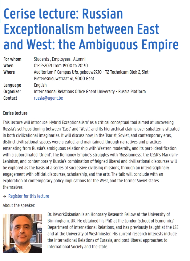 by Dr. Kevork Oskanian OrganizerInternational Relations Office Ghent University - Russia Platform This lecture will introduce « Hybrid Exceptionalism » as a critical conceptual tool aimed at uncovering Russia’s self-positioning between « East » and « West », and its hierarchical claims over subalterns situated in both civilizational imaginaries. It will discuss how, in the Tsarist, Soviet, and contemporary eras, distinct civilizational spaces were created, and maintained, through narratives and practices emanating from Russia’s ambiguous relationship with Western modernity, and its part-identification with a subordinated « Orient » The Romanov Empire’s struggles with « Russianness », the USSR’s Marxism-Leninism, and contemporary Russia’s combination of feigned liberal and civilizational discourses will be explored as the basis of a series of successive civilising missions, through an interdisciplinary engagement with official discourses, scholarship, and the arts. The talk will conclude with an exploration of contemporary policy implications for the West, and the former Soviet states themselves. About the speaker : Dr. Kevork Oskanian is an Honorary Research Fellow at the University of Birmingham, UK. He obtained his PhD at the London School of Economics’ Department of International Relations, and has previously taught at the LSE and at the University of Westminster. His current research interests include the International Relations of Eurasia, and post-liberal approaches to International Society and the state.