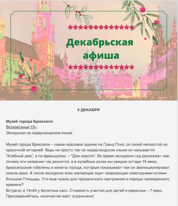 Стоимость : взрослый - €25/чел. Оплата на счет BE26 0689 3006 5329 vzw De Bron с указанием фамилии, даты (19.12.21). Билеты в Дом Рубенса и Собор не входят в стоимость экскурсии Информация : info at vzwdebron.com 0474 07 95 35 at Tatiana Roumiantseva Ждём с нетерпением встречи с вами!! !!Количество мест ограничено!!!