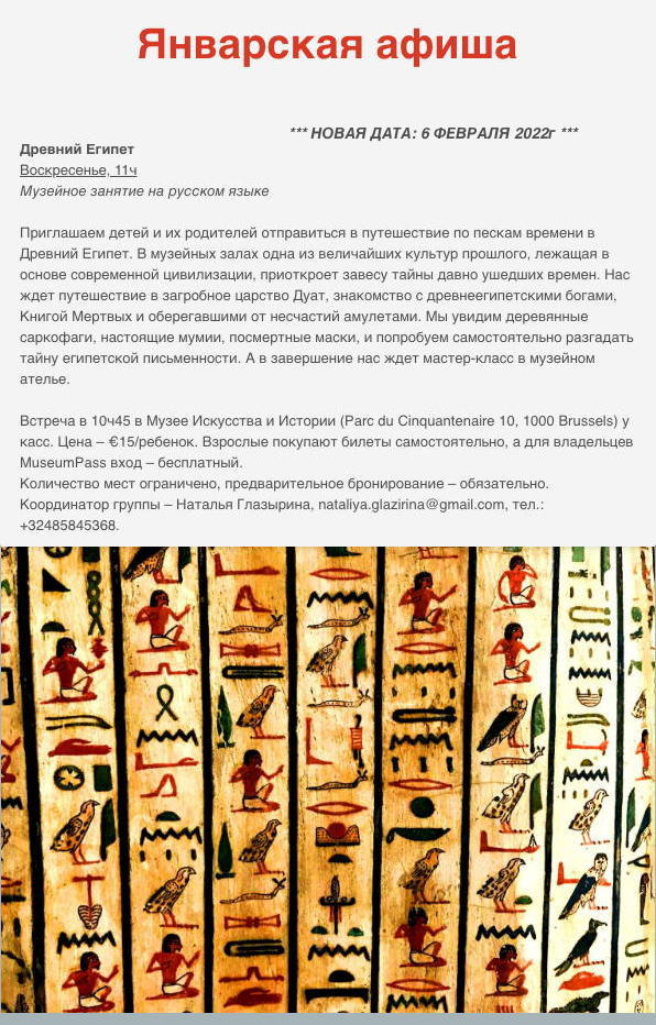 Музейное занятие на русском языке Приглашаем детей и их родителей отправиться в путешествие по пескам времени в Древний Египет. В музейных залах одна из величайших культур прошлого, лежащая в основе современной цивилизации, приоткроет завесу тайны давно ушедших времен. Нас ждет путешествие в загробное царство Дуат, знакомство с древнеегипетскими богами, Книгой Мертвых и оберегавшими от несчастий амулетами. Мы увидим деревянные саркофаги, настоящие мумии, посмертные маски, и попробуем самостоятельно разгадать тайну египетской письменности. А в завершение нас ждет мастер-класс в музейном ателье.