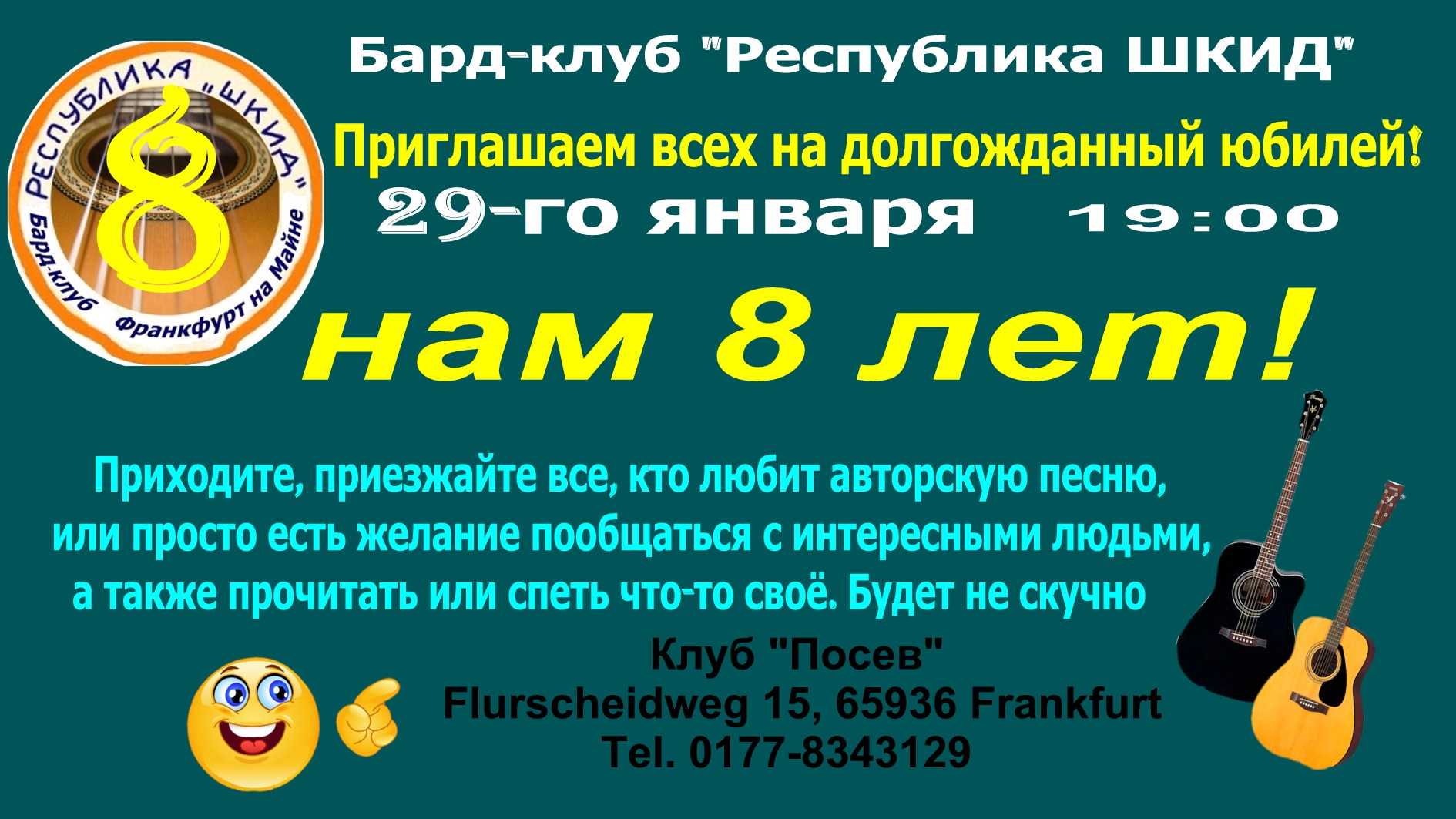 Бард-клуб « Республика ШКИД » Дорогие друзья! Граждане, товарищи, господа и просто приличные люди! Приглашаем всех 29-го января в 19:00 на наш 8-летний юбилей! Как всегда, будет много песен, стихов и хорошего настроения. Играют, поют и чатают все, кто имеет что спеть и прочитать. Наш клуб родился в январе 2014 года в день рождения В.Высоцкого. По устоявшейся традиции в наши дни рождения мы поём и его песни. Однако, темы песен и стихов ни чем не ограниченны и каждый поёт и читает то, что ему по душе. А кто не играет, не поёт и не читает - просто слушает, пьёт и кушает. Выпивки и закуски на любой вкус можно заказать в баре и в кафе у нашей любезной хозяйки Инны. Приходите, приезжайте, прилетайте! Мы ждём всех!