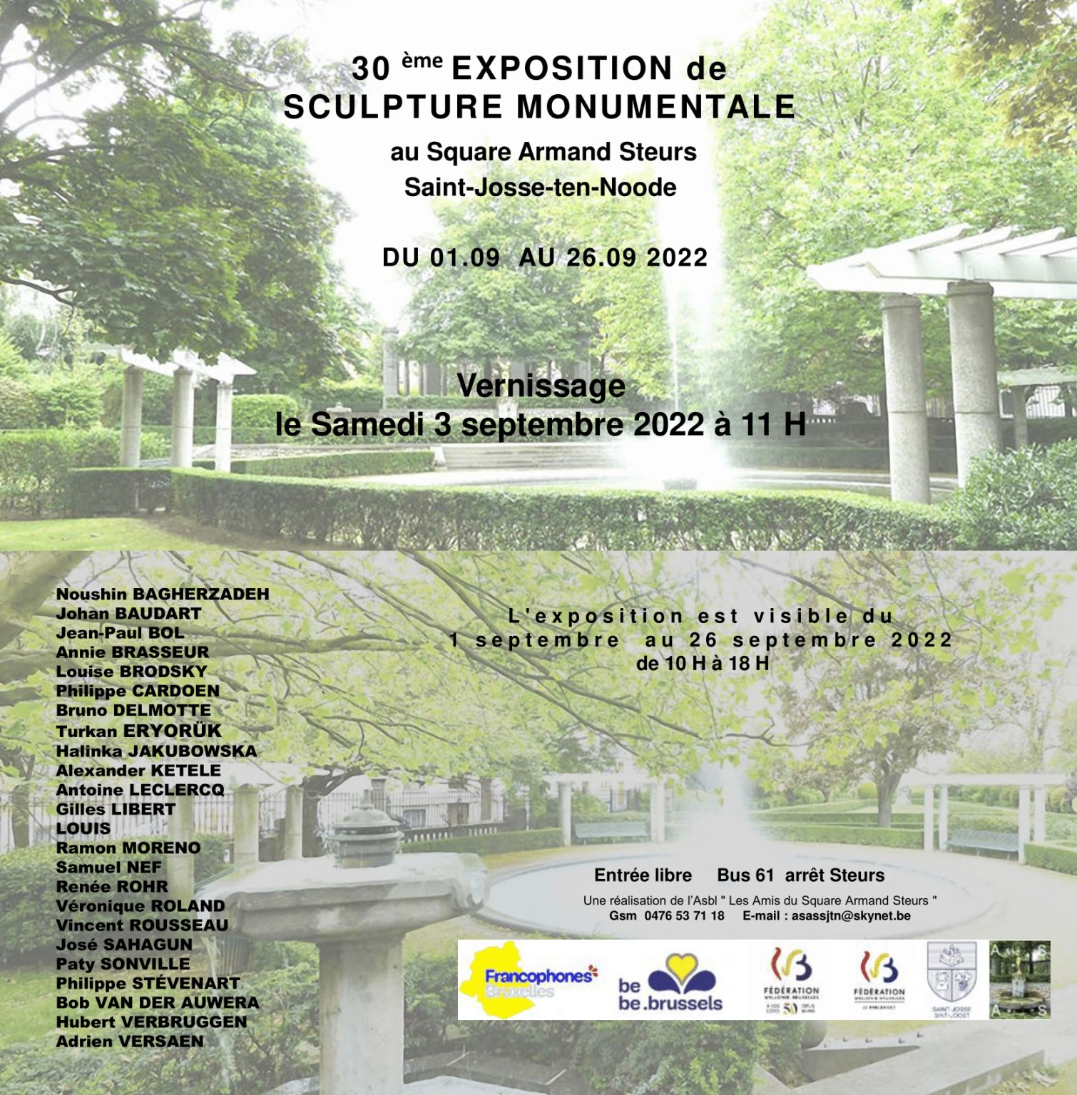 Une réalisation de l'Asbl « Les amis du Square Armand Steurs » Exposants : Noushin BAGHERZADEH | Johan BAUDART | Jean-Paul BOL | Annie BRASSEUR | Louise BRODSKY | Philippe CARDOEN | Bruno DELMOTTE | Turkan ERYORÜK | Halinka JAKUBOWSKA | Alexander KETELE | Antoine LECLERCQ | Gilles LIBERT | LOUIS | Ramon MORENO | Samuel NEF | Renée ROHR | Véronique ROLAND | Vincent ROUSSEAU | José SAHAGUN | Paty SONVILLE | Philippe STÉVENART | Bob VAN DER AUWERA | Hubert VERBRUGGEN | Adrien VERSAEN