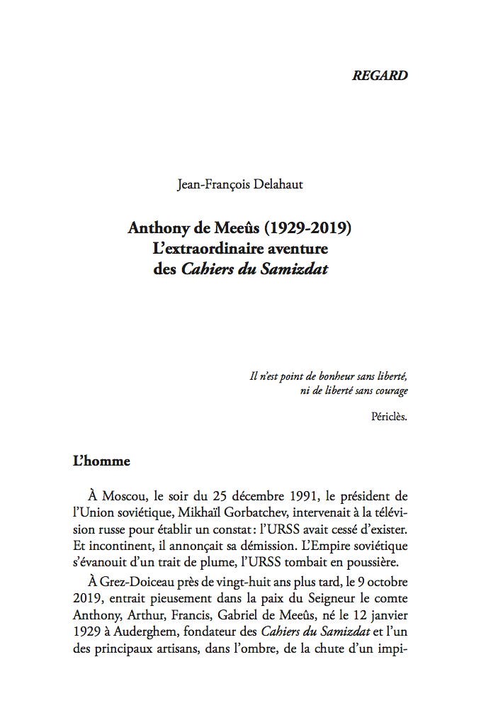 Regard par Jean-François Delahaut Revue générale - Réflexion et culture, Septembre 2022 № 3, pp.: 137-182 L’homme À Moscou, le soir du 25 décembre 1991, le président de l’Union soviétique, Mikhaïl Gorbatchev, intervenait à la télévi- sion russe pour établir un constat : l’URSS avait cessé d’exister. Et incontinent, il annonçait sa démission. L’Empire soviétique s’évanouit d’un trait de plume, l’URSS tombait en poussière. À Grez-Doiceau près de vingt-huit ans plus tard, le 9 octobre 2019, entrait pieusement dans la paix du Seigneur le comte Anthony, Arthur, Francis, Gabriel de Meeûs, né le 12 janvier 1929 à Auderghem, fondateur des Cahiers du Samizdat et l’un des principaux artisans, dans l’ombre, de la chute d’un impitoyable système totalitaire qui se croyait promis à l’éternité. • • • • • L’oeuvre — Un premier coup de maître - page 144 Le soutien aux dissidents - page 147 Les Cahiers du Samizdat (1972-1988) - page 159 Le rêve d’une Russie européenne et démocratique - page 168 Ce que nous dit Anthony de Meeûs en 2022 - page 172 La Russie est européenne - page 177 Conclusion - page 180
