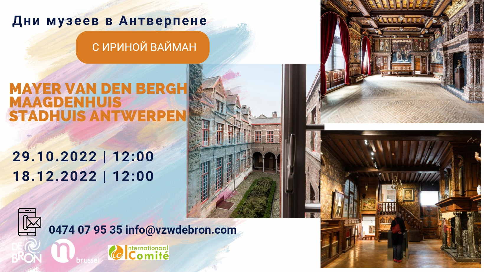 Стоимость экскурсии : €25/чел. (!входные билеты в музеи не включены!)* Оплата на счет BE 26 0689 3006 5329 vzw De Bron с указанием фамилии, даты и кол-во мест (29.10.22, Antwerpen). Информация : info at vzwdebron.com / 0474 07 95 35 / at Tatiana Roumiantseva *Стоимость билетов в : Museum Mayer van den Bergh Взрослый 10€/ 6€ групповой (мин 12чел) Maagdenhuis Взрослый 8€/ 6€ групповой (мин 12чел) Возможен бесплатный вход для людей, имеющих Museumpas, Antwerp City Card, Libelle City Card, либо UiTPAS met VT-statuut, для людей, получающих социальную