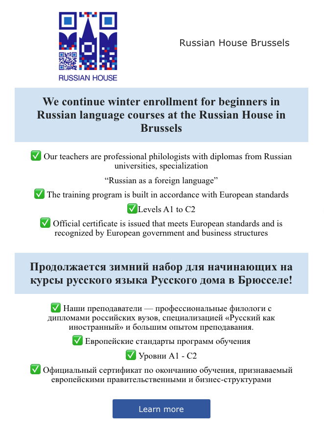 par Maison russe Bruxelles-Europe We continue winter enrollment for beginners in Russian language courses at the Russian House in Brussels » The training program is built in accordance with European standards Levels A1 to C2 Official certificate is issued that meets European standards and is recognized by European government and business structures