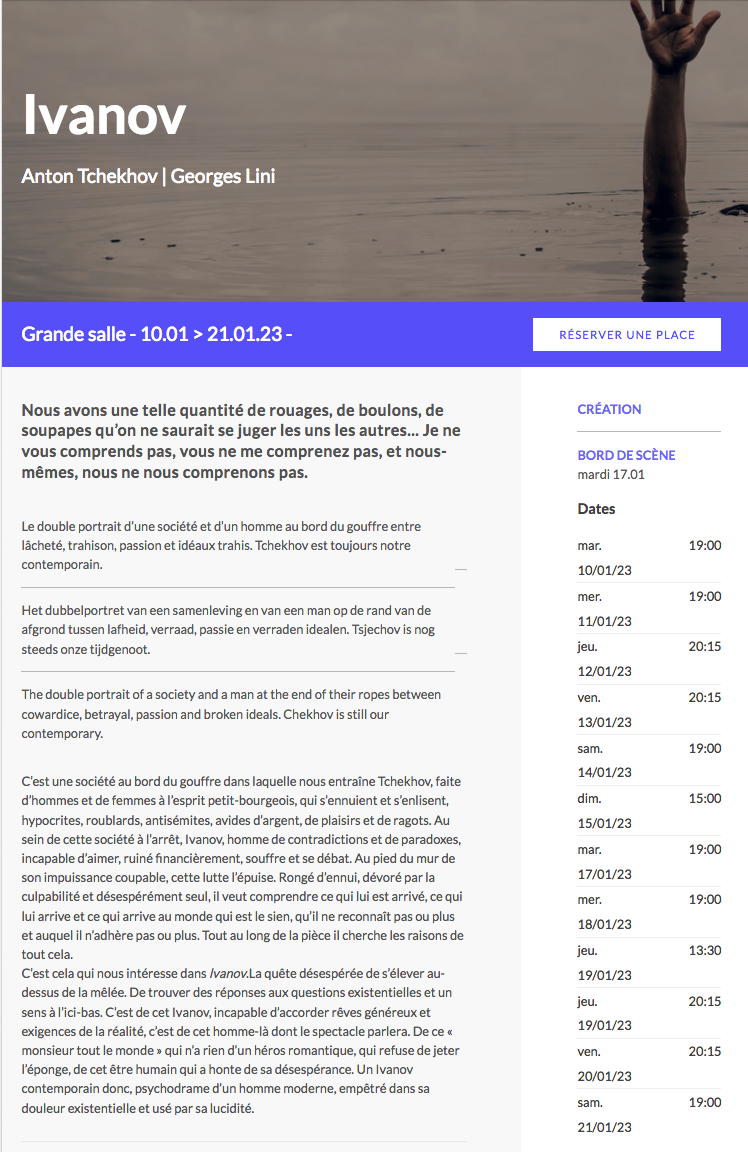 Dates : 29/01 → 15:00 / 31/01 → 19:30 / 01-02/02 → 19:30 / 04-/02→ 19:30 / 02/05 → 15:00 / 07/02 → 19:30 / 09-10/02 → 19:30 / 12/02→ 15:00 / 14/02 → 19:30