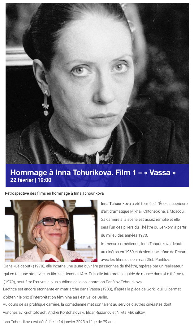Réalisateur : Gleb Panfilov, avec : Inna Churikova, Vadim Medvedev, Olga Mashnaya, Yana Poplavskaya 1983*138 min. / Sous-titres anglais. Rétrospective des films en hommage à Inna Tchourikova Inna Tchourikova a été formée à l’École supérieure d’art dramatique Mikhaïl Chtchepkine, à Moscou. Sa carrière à la scène est assez remplie et elle sera l’un des piliers du Théâtre du Lenkom à partir du milieu des années 1970. Immense comédienne, Inna Tchourikova débute au cinéma en 1960 et devient une icône de l’écran avec les films de son mari Gleb Panfilov. Dans «Le début» (1970), elle incarne une jeune ouvrière passionnée de théâtre, repérée par un réalisateur qui en fait une star avec un film sur Jeanne d’Arc. Puis elle interprète la guide de musée dans «Le thème » (1979), peut-être l’œuvre la plus sublime de la collaboration Panfilov-Tchourikova. L’actrice est encore étonnante en matriarche dans Vassa (1983), d’après la pièce de Gorki, qui lui permet d’obtenir le prix d’interprétation féminine au Festival de Berlin. Au cours de sa prolifique carrière, la comédienne met son talent au service d’autres cinéastes dont Viatcheslav Krichtofovich, Andreï Kontchalovski, Eldar Riazanov et Nikita Mikhalkov. Inna Tchourikova est décédée le 14 janvier 2023 à l’âge de 79 ans.