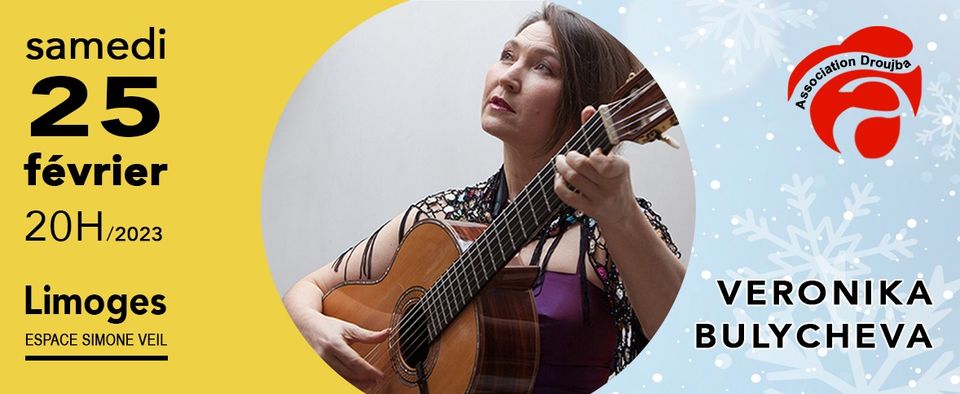 Concert de Veronika Bulycheva, auteure, compositrice et interprète, organisé par l'association Droujba de Limoges et la manageuse Tsetsa Giry. Cette fois-ci Veronika Bulycheva présentera son répertoire de chansons en russe et français en solo accompagnée de sa guitare.