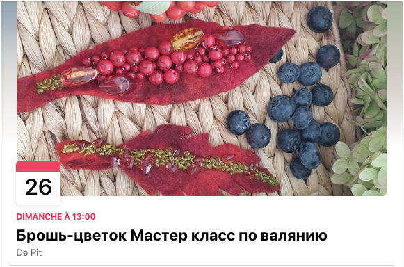 par Anastassiya Fetissova Милые девочки, дорогие мамочки, В предверии весны, тепла и цветов приглашаю вас на свой мастер-класс по валянию цветка-броши. Что: Мастер класс по валянию из чистой шерсти – цветок на выбор. Я расскажу о правилах раскладки, о поведении шерсти в мыльной среде, рассмотрим различные декоративные волокна (лен, шелк, конопля, вискоза) и эффект, который они дают на шерсти. Мы создадим уникальный, неповторимый цветок-брошь, которым можно будет украсить лацкан пиджака и пальто, прикрепить к резинке на волосы, на тканевую сумку, на ремень, браслет... Сколько: 25 евро с человека, все материалы включены в стоимость, каждый участник унесет с собой готовое изделие. Помимо этого будет предложено угощение: кофе/чай, выпечка и фрукты. Внимание: резервация места подтверждается оплатой МК. всего 10 человек в группе МК пройдет на русском языке, я также говорю по англ, гол и фр – приглашайте своих друзей, вместе будет веселее!