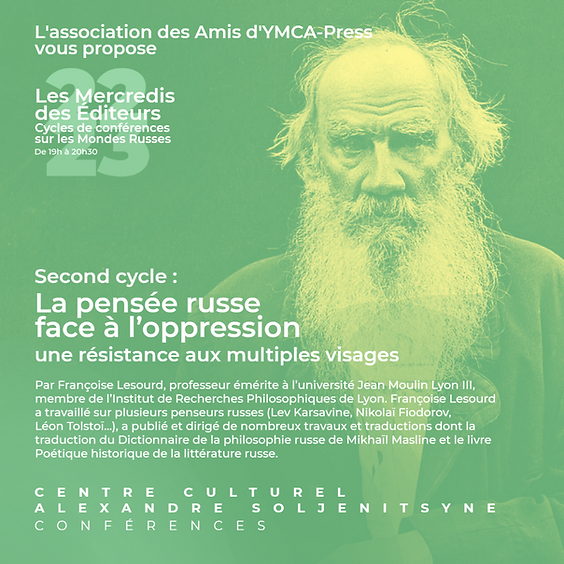 par Françoise Lesourd, professeur émérite à l’université Jean Moulin Lyon III, Les Éditeurs Réunis - Centre culturel Alexandre Soljenitsyne Association des Amis d'YWCA-Press Cycle de conférences : La pensée russe face à l’oppression : une résistance aux multiples visages Par Françoise Lesourd, professeur émérite à l’université Jean Moulin Lyon III, membre de l’Institut de Recherches Philosophiques de Lyon. Françoise Lesourd a travaillé sur plusieurs penseurs russes (Lev Karsavine, Nikolaï Fiodorov, Léon Tolstoï…), elle a dirigé la traduction du Dictionnaire de la philosophie russe de Mikhaïl Masline, traduit et publié le livre Poétique historique de la littérature russe – une sélection d’œuvres de Dmitri Likhatchov (spécialiste de littérature russe ancienne, qui lui redonna sa place dans le processus culturel ; il fut l’un des principaux artisans de la perestroïka). Elle a également publié une traduction commentée du Poème de la mort de Lev Karsavine, et récemment dirigé la traduction de la Philosophie de l’œuvre commune de Nikolaï Fiodorov aux éditions des Syrtes. Chers amis, ✨ Nous reprenons le cycle des Mercredis des Éditeurs Réunis. Cette fois-ci, et dès le 1er février à 19 heures, nous recevrons Françoise Lesourd, professeur émérite de l'université Jean Moulin Lyon III, qui a dirigé la traduction du Dictionnaire de la philosophie russe de Mikhaïl Masline, traduit et publié le livre Poétique historique de la littérature russe – une sélection d’œuvres de Dmitri Likhatchov (spécialiste de littérature russe ancienne, qui lui redonna sa place dans le processus culturel ; il fut l’un des principaux artisans de la perestroïka). Elle a également publié une traduction commentée du Poème de la mort de Lev Karsavine, et a récemment dirigé la traduction de la Philosophie de l’œuvre commune de Nikolaï Fiodorov aux éditions des Syrtes. Françoise Lesourd présentera cinq conférences sur le thème La pensée russe face à l'oppression : une résistance aux multiples visages. Voici le programme (la version détaillée est disponible sur notre site internet)