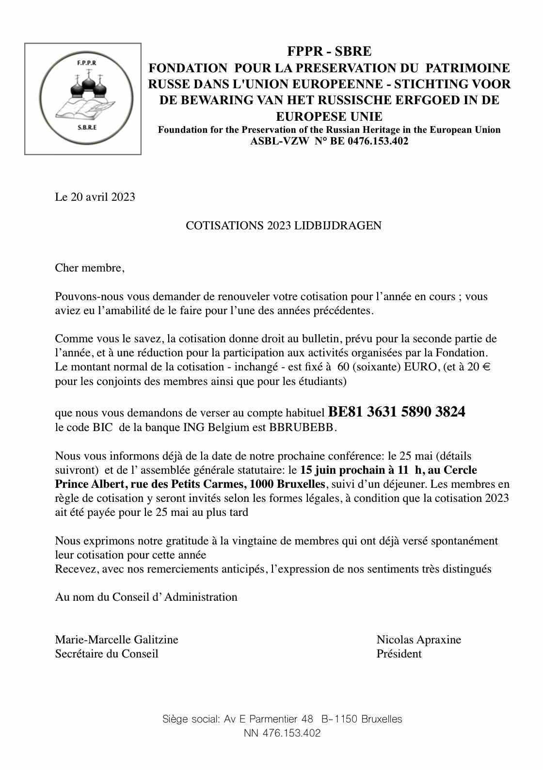 - de préférence par versement bancaire direct - Bénéficiaire : Paroisse Saints Pantéleimon et Nicolas Banque : BNP Fortis Paribas IBAN : BE 04 0017 3167 6231 BIC : GEBABEBB Communication : « Soutien à la défense en justice » ;