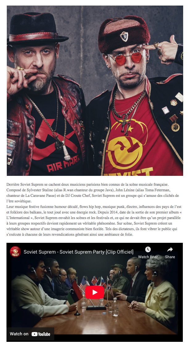 Festival Welcome in Tziganie. Derrière Soviet Suprem se cachent deux musiciens parisiens bien connus de la scène musicale française. Composé de Sylvester Staline (alias R.wan chanteur du groupe Java), John Lénine (alias Toma Feterman, chanteur de La Caravane Passe) et de DJ Croute Chef, Soviet Suprem est un groupe qui s’amuse des clichés de l’ère soviétique. Leur musique festive fusionne humour décalé, flows hip hop, musique punk, électro, influences des pays de l’est et folklore des balkans, le tout joué avec une énergie rock. Depuis 2014, date de la sortie de son premier album « L’International », Soviet Suprem envahit les scènes et les festivals et, ce qui ne devait être qu’un projet parallèle à leurs groupes respectifs devient rapidement un véritable phénomène. Sur scène, Soviet Suprem créent un véritable show autour d’une imagerie communiste bien ficelée. Tels des dictateurs, ils font vibrer le public qui s’exécute à chacune de leurs revendications générant ainsi une ambiance de folie. JUAN CARMONA – 18H30 IONICA MINUNE – 20H30 SOVIET SUPREM – 22H30 ENERGY BAND – 00H30 DJ SPERY – 2H