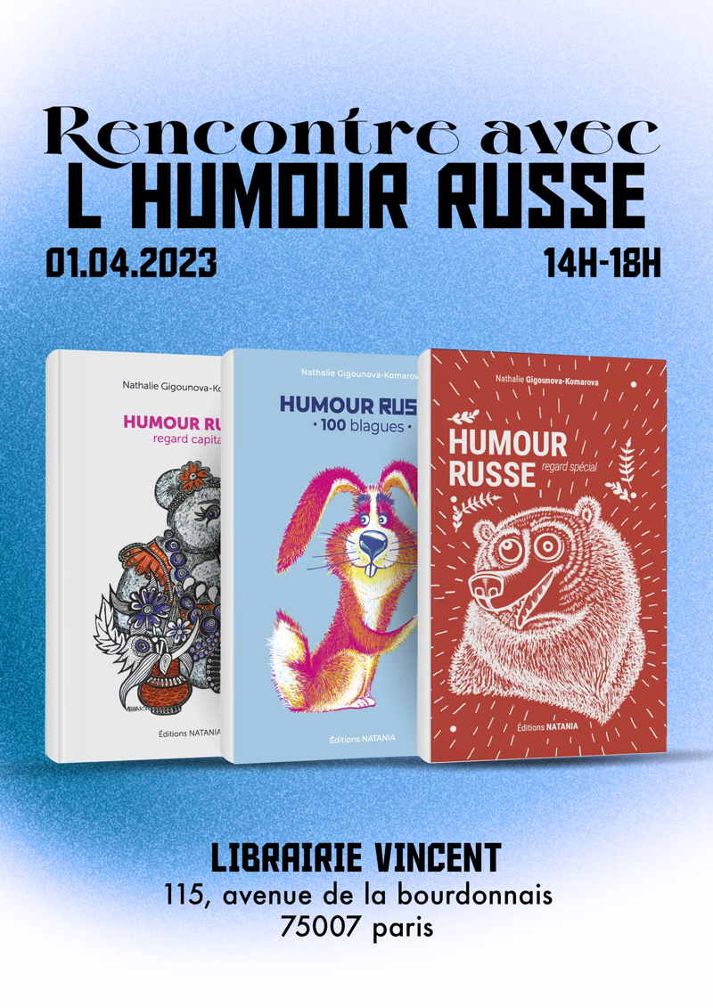 par Nathalie Gigounova-Komarova Rencontre, dédicace et dégustation de vodka avec les éditions Natania L'humour russe est l'une des plus importantes formes de culture populaire verbale mais, hélas, presque aucune de ses riches traditions n'a été exportée à l'Ouest. Ce premier recueil vient combler ce manque en mettant en lumière un humour parfois piquant, acerbe et bourré d'autodérision.