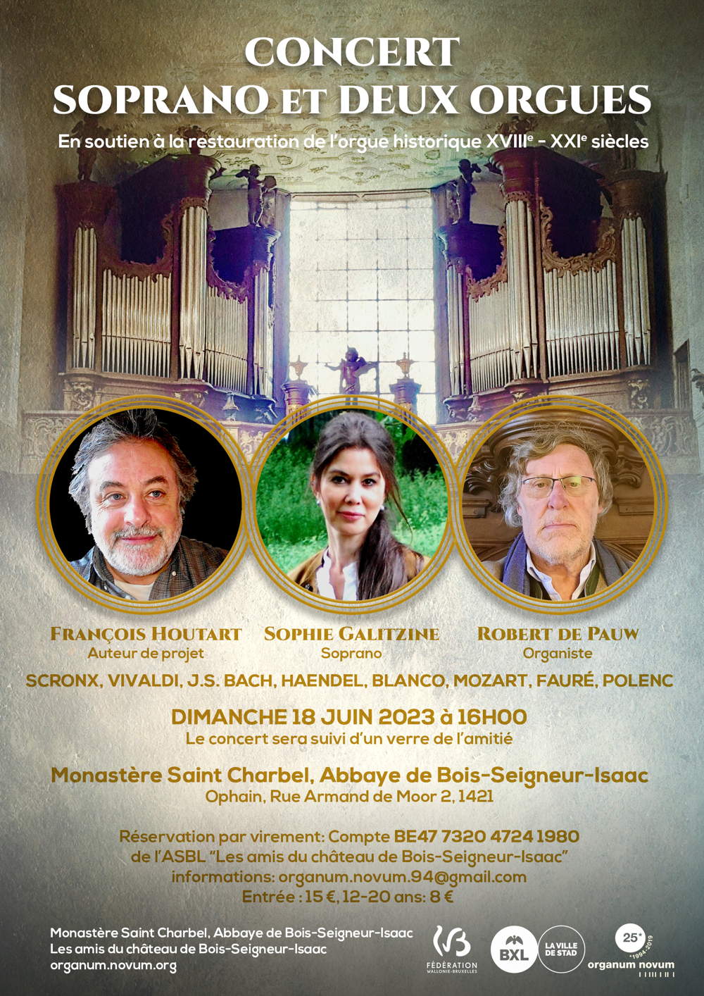 , Sophie Galitzine (Soprano) et Robert de Pauw (Organiste). 01. 2023-06-18.jpg) François Houtart (Auteur de projet), Sophie Galitzine (Soprano) et Robert de Pauw (Organiste). | , Sophie Galitzine (Soprano) et Robert de Pauw (Organiste). 02. 2023-06-18.jpg) En soutien à la restauration de l'orgue historique XVIIIe - XXle siècles. |