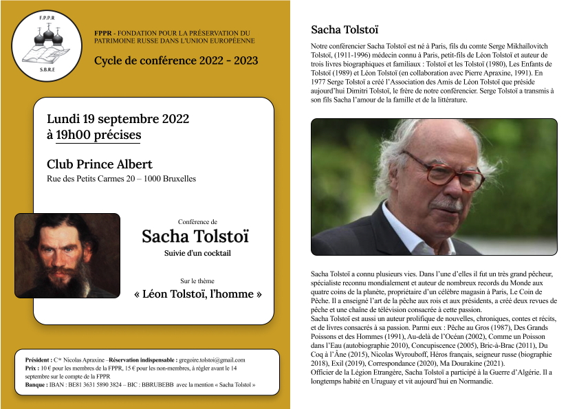 Prix : 10 € pour les membres FPPR, 15 € pour les non-membres à régler avant le 14 septembre sur le compte IBAN: BE81 3631 5890 3824 / BIC: BBRUBEBB de la FPPR avec la mention « Sacha Tolstoï ». Réservation indispensable à gregoire.tolstoi at gmail.com.