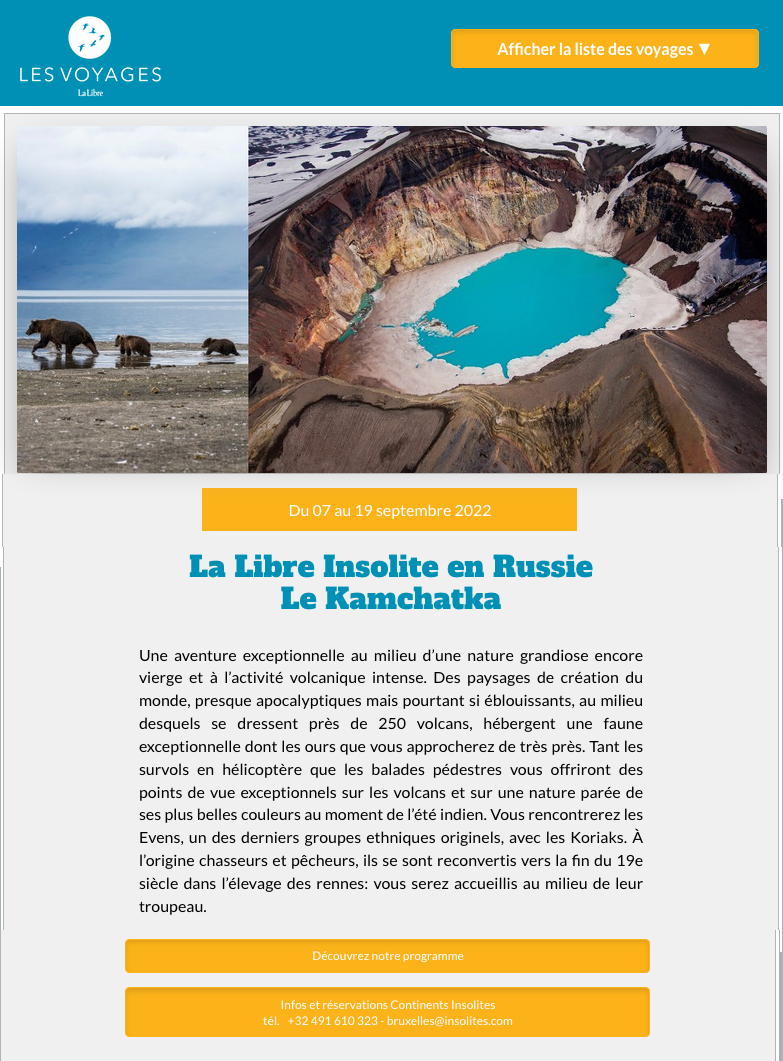 La Libre - Les voyages Une aventure exceptionnelle au milieu d’une nature grandiose encore vierge et à l’activité volcanique intense. Des paysages de création du monde, presque apocalyptiques mais pourtant si éblouissants, au milieu desquels se dressent près de 250 volcans, hébergent une faune exceptionnelle dont les ours que vous approcherez de très près. Tant les survols en hélicoptère que les balades pédestres vous offriront des points de vue exceptionnels sur les volcans et sur une nature parée de ses plus belles couleurs au moment de l’été indien. Vous rencontrerez les Evens, un des derniers groupes ethniques originels, avec les Koriaks. À l’origine chasseurs et pêcheurs, ils se sont reconvertis vers la fin du 19e siècle dans l’élevage des rennes: vous serez accueillis au milieu de leur troupeau.