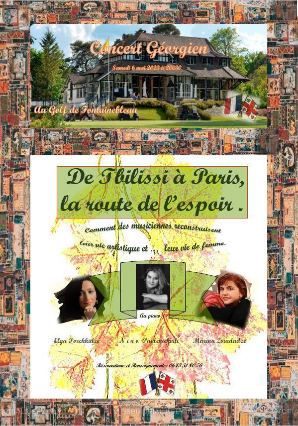 Organisé par Faites entrer les musiciens Chers amis, Ceci est un rappel à propos de notre prochain concert, « De Tbilissi à Paris, le chemin de l'espoir! », qui aura lieu au Golf de Fontainebleau le samedi 6 mai prochain. Il s'agit d'un programme totalement inédit, conçu spécialement à la demande de Faites entrer les musiciens!, et interprété par trois grandes artistes d'origine géorgienne, Marina Zviadadzé de l'Opéra National de Paris, Elga Porchkidzé, grande vedette de cabaret et Nino Pavlenichvili, pianiste. Le programme (composé d'un choix de mélodies et chansons à la fois géorgiennes et françaises) a été conçu de manière à vous faire revivre le parcours émouvant des deux chanteuses qui ont choisi l'exil plutôt que de vivre sous les bombes et qui, grâce à leur talent et à l'accueil de la France, ont refait leur vie chez nous et sont devenues françaises. Comme toutes les soirées musicales de Faites entrer les musiciens ! le concert sera suivi d'un cocktail préparé par Michaël Daviron, le restaurateur attitré du Golf de Fontainebleau. Pour ce concert nous avons la chance d'être accueillis au Golf de Fontainebleau, un lieu plus que centenaire, d'une beauté poétique, niché au cœur de la plus belle forêt de France. Un cocktail suivra la partie musicale et nous permettra d'échanger avec les musiciennes. Pour ce magnifique privilège nous remercions infiniment Monsieur Jean-Paul Panié, président du golf, ainsi que Monsieur Christian Macjer, son directeur. Vous ne le savez que trop, Faites entrer les musiciens ! est une association dont le but est, avant tout, d'aider les musiciens. Ainsi, vos participations sont reversées intégralement aux musiciens, une fois nos frais d'organisation couverts. Aussi, nous espérons que vous viendrez nombreux pour soutenir les artistes et découvrir ce spectacle inédit. N'hésitez pas également à venir avec des amis. Bien amicalement à tous, Catherine Galitzine, Présidente