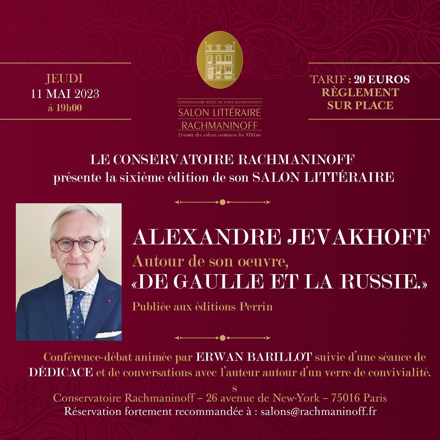 Président : Cte Nicolas Apraxine Réservation : gregoiretolstoi at gmail.com Prix : 10 € pour les membres de la FPPR, 15 € pour les non-membres, à régler avant le 18 mai sur le compte de la FPPR. Banque : IBAN : BE81 3631 5890 3824 - BIC : BBRUBEBB avec la mention « Znamensky »