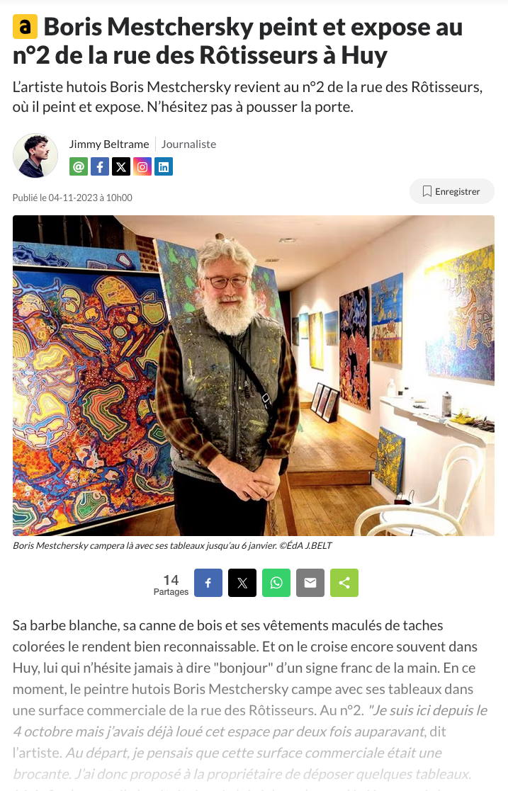 Сайт/Site : https://www.lavenir.net/regions/huy-waremme/huy/2023/11/04/boris-mestchersky-peint-et-expose-au-n2-de-la-rue-des-rotisseurs-a-huy-BDBUEQD6U5AYHF73VXP27PL7YA/
