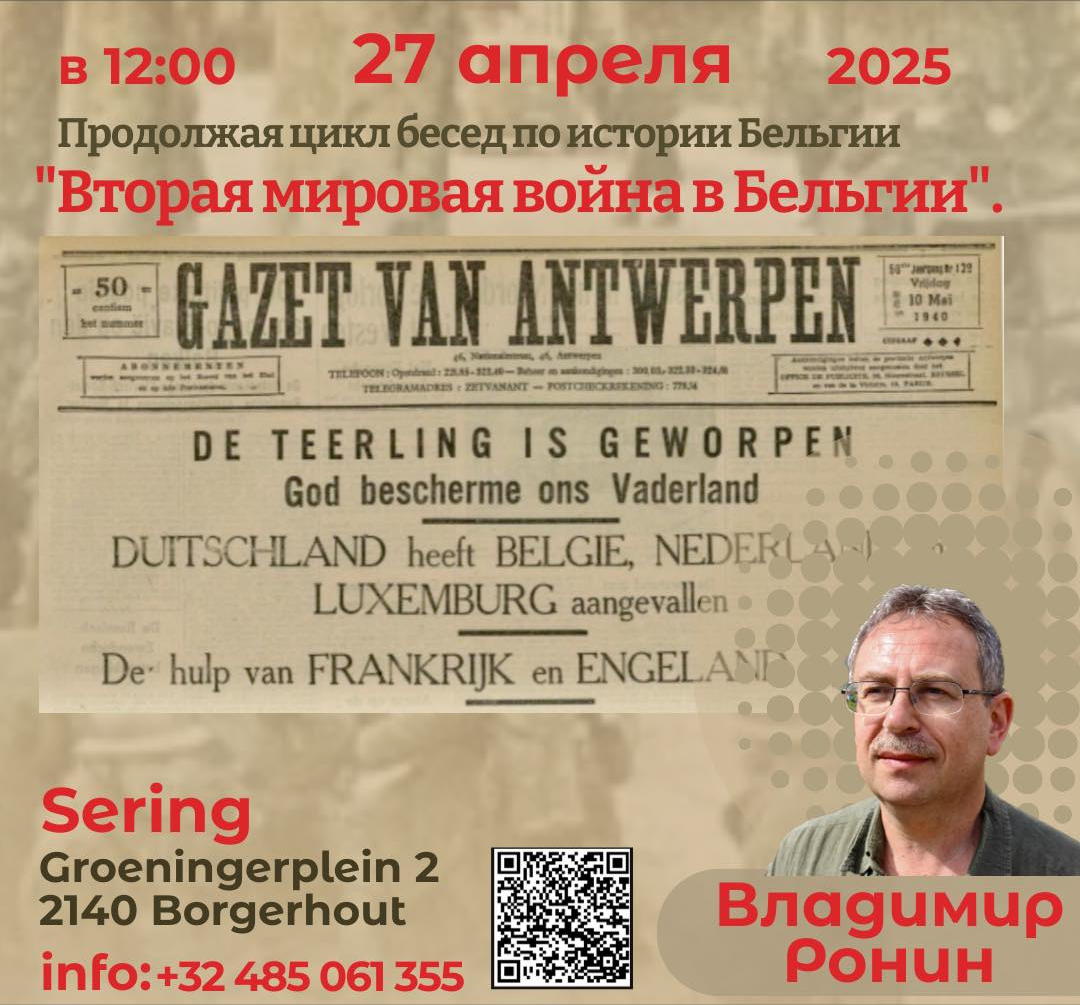 Владимир Ронин, Culture connection vzw - Click Club Event Продолжения цикл бесед по истории Бельгии Творческое объединение Culture Connection VZW представляет: В воскресенье, 27 апреля, в 12:00 в городе Антверпен, в зале Sering, состоится встреча с Владимиром Карловичем Рониным. Тема встречи: «Вторая мировая война в Бельгии.» "Продолжая цикл бесед по истории Бельгии, предлагаем встречу на тему "Вторая мировая война в Бельгии". Историк Владимир Ронин расскажет об основных событиях здесь в 1940-1945 годах и об их восприятии бельгийцами впоследствии. Особо он отметит то, что ему самому, приехавшему 35 лет назад из СССР, показалось необычным, подчас даже неожиданным в том, как жила тема Второй мировой войны в сознании бельгийцев в последние десятилетия". Приходите! Будет интересно. Забронировать места, купить билеты и узнать более подробную информацию вы можете на нашем сайте — пройдя по следующей ссылке или отсканировав QR-код.