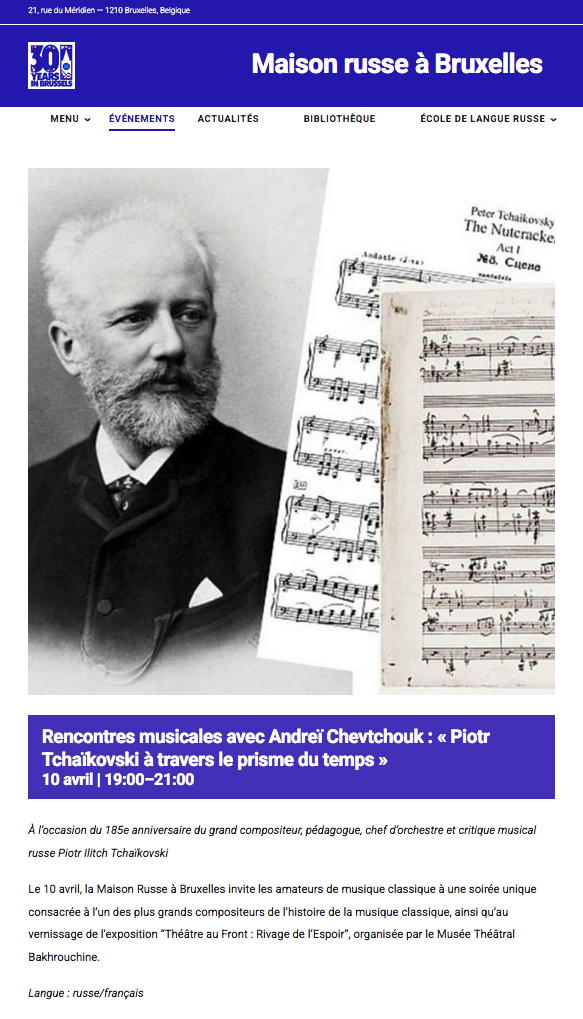 |  | 10 avril | 19:00–21:00 - Rencontres musicales avec Andreï Chevtchouk : « Piotr Tchaïkovski à travers le prisme du temps » À l’occasion du 185e anniversaire du grand compositeur, pédagogue, chef d’orchestre et critique musical russe Piotr Ilitch Tchaïkovski Le 10 avril, la Maison Russe à Bruxelles invite les amateurs de musique classique à une soirée unique consacrée à l'un des plus grands compositeurs de l'histoire de la musique classique, ainsi qu'au vernissage de l'exposition « Théâtre au Front : Rivage de l'Espoir », organisée par le Musée Théâtral Bakhrouchine. Langue : russe/français S'inscrire Les invités seront transportés dans un véritable voyage musical à travers le temps, guidés par Maestro Andreï Chevtchouk, chef d’orchestre et maître de chœur d’exception, dont la brillante carrière s’étend [...] |