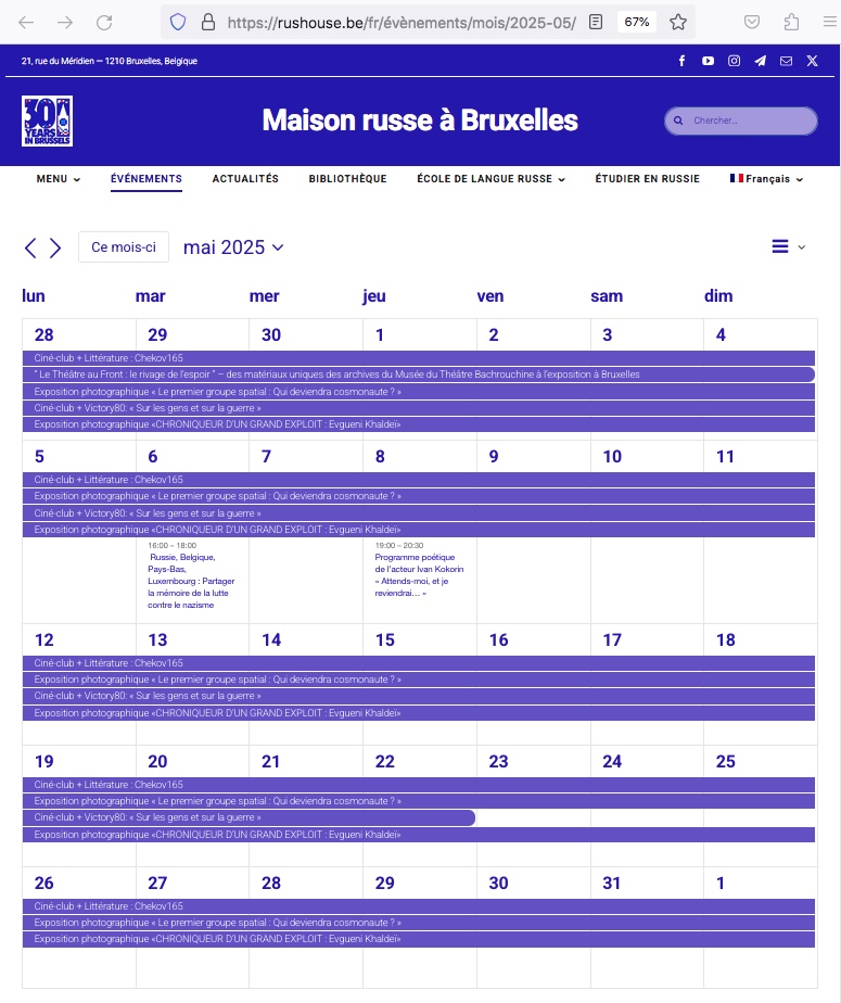 Page Internet. Maison russe Bruxelles-Europe. Calendrier des événements culturels de mai 2025. 2025-05-01