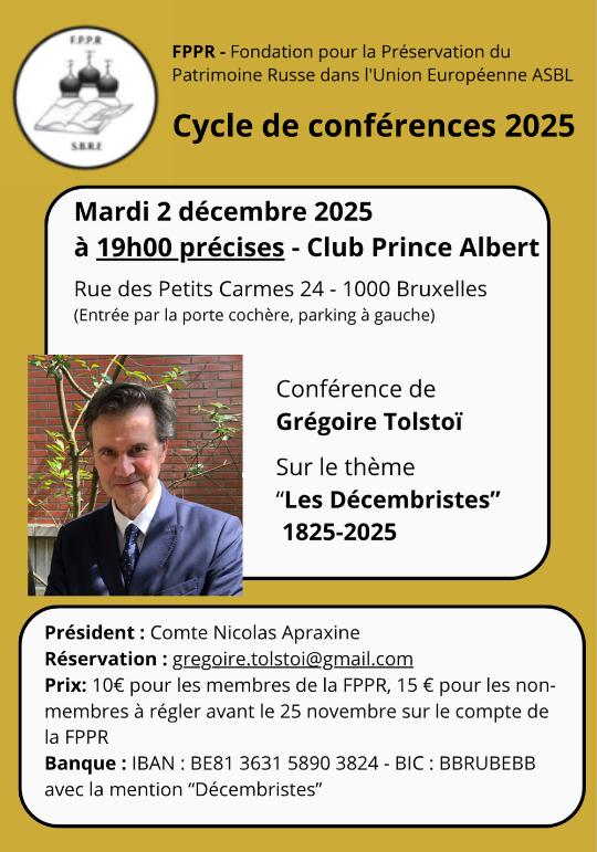 Président : Comte Nicolas Apraxine Réservation : gregoire.tolstoi at gmail.com Prix : 10€ pour les membres de la FPPR, 15€ pour les non-membres. à régler avant le 25 novembre sur le compte de la FPPR. Banque : IBAN : BE81 3631 5890 3824 - BIC: BBRUBEBB avec la mention « Décembristes ».