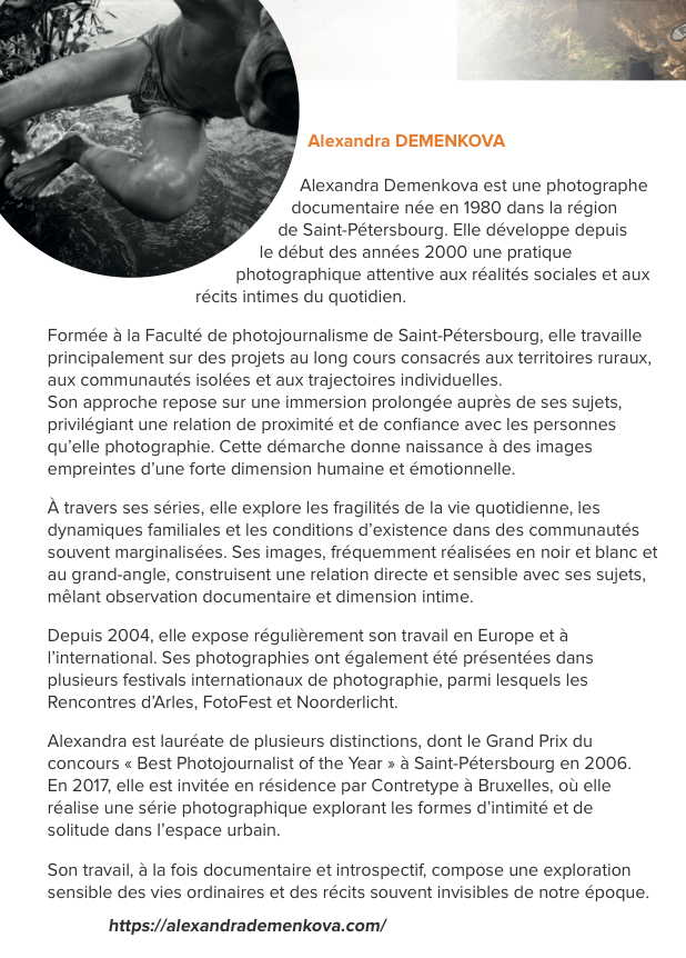 Alexandra Demenkova est une photographe documentaire née en 1980 dans la région de Saint-Pétersbourg. Elle développe depuis le début des années 2000 une pratique photographique attentive aux réalités sociales et aux récits intimes du quotidien.