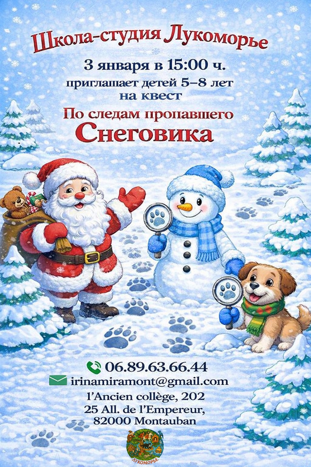 Детская школа-студия « Лукоморье ». В зимнем лесу, где живут сказки, начинается волшебное новогоднее приключение.... Однажды, в ночь, когда звёзды замирают, а снежинки шепчут тайны, случилось невероятное -пропал Снеговик. Метель унесла его следы, лес замолчал, а Дед Мороз и его верный друг - собака Сириус ждут помощи… И эта помощь - вы, наши юные спасатели!