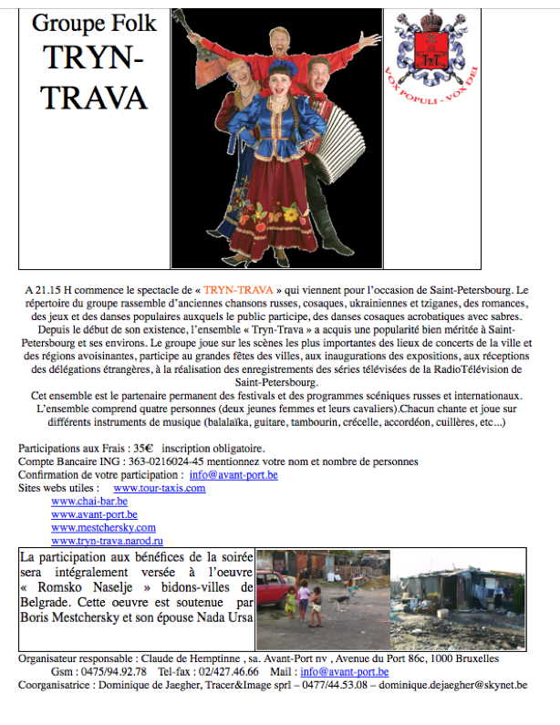 La participation aux bénéfices de la soirée sera intégralement versée à l’œuvre « Romsko Naselje » bidons-villes de Belgrade. Cette œuvre est soutenue par Boris Mestchersky et son épouse Nada Ursa.