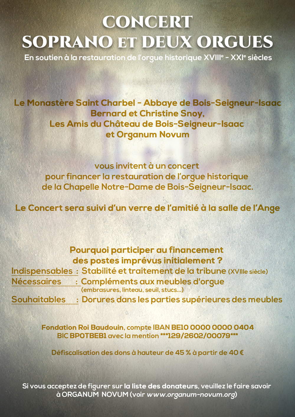 François Houtart (Auteur de projet), Sophie Galitzine (Soprano) et Robert de Pauw (Organiste) En soutien à la restauration de l'orgue historique XVIIIe - XXle siècles Le Monastère Saint Charbel - Abbaye de Bois-Seigneur-Isaac Bernard et Christine Snoy, Les Amis du Château de Bois-Seigneur-Isaac et Organum Novum vous invitent à un concert pour financer la restauration de l'orgue historique de la Chapelle Notre-Dame de Bois-Seigneur-Isaac. Le concert sera suivi d'un verre de l'amitié à la salle de l'Ange