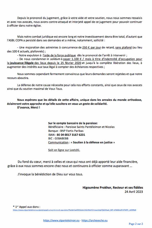 Higoumène Prokhor Paroisse Orthodoxe Saint Panteleimon et Saint Nicolas à Bruxelles (1929) Joyeuses Pâques! Mesdames et Messieurs les Présidents des associations russes, chers amis, Grâce à notre appel aux dons lancé en octobre 2022 pour garantir le maintien de notre paroisse historique dans ses murs, nous avons pu faire face à cinq mois d’astreintes d’occupations et nous vous en remercions du fond du coeur. Si nous avons eu le bonheur de recevoir votre soutien financier, nous n’avons pas encore pû rassembler la somme complète. Nous devons absolument pouvoir tenir jusqu’au 11 septembre de cette année. Après cette date nous pourrons attendre sereinement le jugement d’appel qui n’aura pas lieu avant deux-trois ans selon l’encombrement des cours et tribunaux. Comme pour le premier appel aux dons, vous trouverez le texte de l’appel sur le site de notre paroisse. Le texte sous format .pdf, écrit dans les deux langues est mis en pièce-jointe, il a la particularité d’exposer une très brève historique de notre paroisse fondatrice de la SPRL COPA et la description de ce que ses administrateurs actuels nous réclament auprès du tribunal. Mesdames et Messieurs les Présidents d’associations, c’est avec beaucoup d’espoir que je m’adresse encore à vous pour vous demander de diffuser parmi vos membres le présent deuxième appel, nous avons encore beaucoup besoin de vos soutiens et prières … Que le Seigneur vous bénisse et vous ait en Sa sainte garde ! Higoumène Prokhor, Recteur de la paroisse des saints Pantéleimon et Nicolas à Bruxelles Le dossier en détails