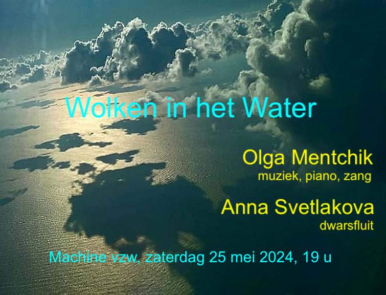 door Olga Mentchik, muziek, piano en zang en Anna Svetlakova, dwarsfluit. Op het programma: de composities van Olga Mentchik, die zijn gebaseerd op impressionistische schilderijen. 1. Leitmotiev Wolken in het water 2. Goudvissen H. Matisse, piano O. Mentchik, dwarsfluit A. Svetlakova. 3. Huren aan zee, tekst Miriam Van Hee, piano, stem O. Mentchik. 4. Waterlelies Claude Monet, piano O. Mentchik, dwarsfluit A. Svetlakova. 5. Hou me voor de gek, piano, stem O. Mentchik, dwarsfluit A. Svetlakova 6. Vrouw met parasol Claude Monet, piano O. Mentchik, dwarsfluit A. Svetlakova. 7. Le jardin Camille Pissaro, piano O. Mentchik, dwaarsfluit A. Svetlakova. 8. Leitmotiev Wolken in het water. 9. De schommel P. August Renoir, piano O. Mentchik. 10. Tederheid, tekst Marina Cvetaeva, piano, stem O. Mentchik, dwarsfluit A. Svetlakova. 11. Lippen, tekst Ann De Moor, piano, stem O. Mentchik. 12. Jeune Femme Berthe Morisot, piano O. Mentchik, dwarsfluit A. Svetlakova. 13. Arabesken, tekst Raisa Ruttenberg, piano, stem O. Mentchik. 14. Berthe Morisot Edouard Manet, piano O. Mentchik, dwarsfluit A. Svetlakova.