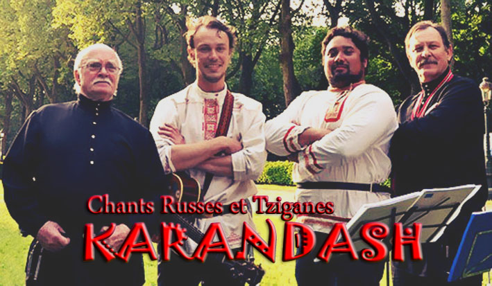 Troisième concert de bienfaisance semi-privé donné par l'ensemble folk « Karandash ». Ilya et Ilyoucha Stepanow, Alexandre Chestopalov, Yasha Golembiowski et leurs guitares offrent un petit intermède de musique variée russe, barde et tzigane, aux pensionnaires Pachéco.