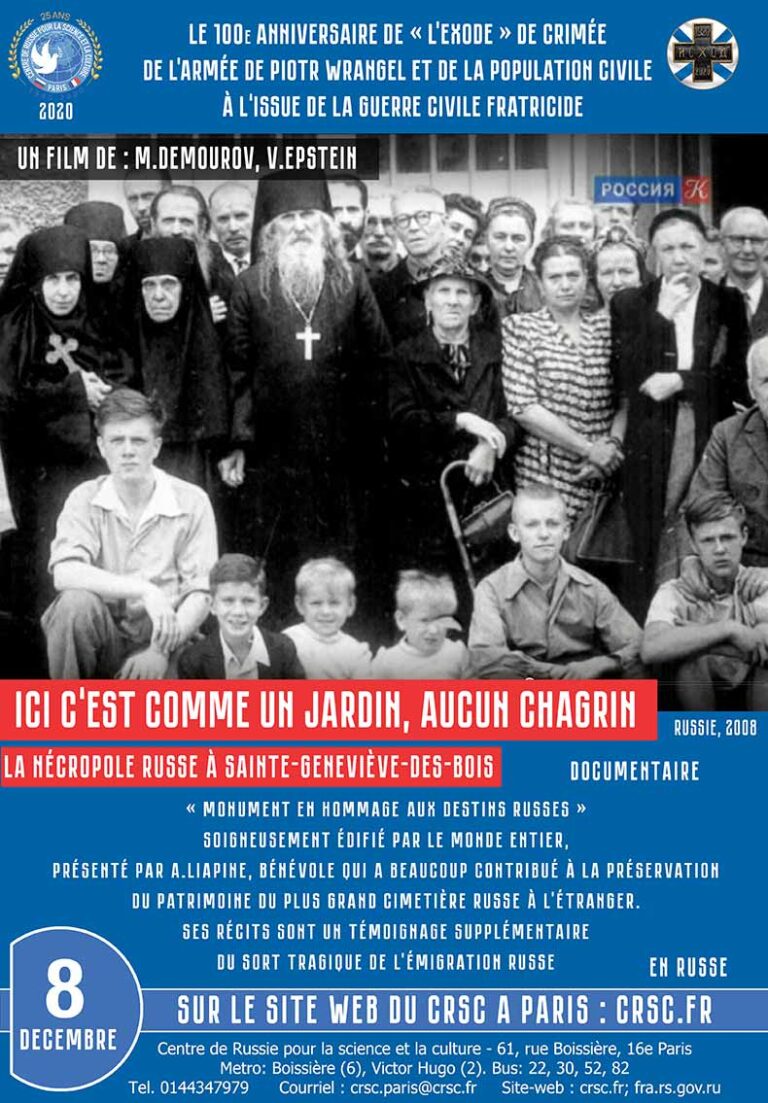 Le 100e anniversaire de « L’Exode » de Crimée de l’Armée de Piotr Wrangler et de la population civile à l’issue de la guerre civile fratricide. Documentaire « Ici c’est comme un jardin, aucun chagrin. La nécropole russe à Saint-Geneviève-Des-Bois » (Russie, 2008) « Monument en hommage aux destins russes » soigneusement édifié par le monde entier, présenté par A. Liapine, bénévole qui a beaucoup contribué à la préservation du patrimoine de plus grand cimetière russe à l’étranger, ses récits sont un témoignage supplémentaire du sort tragique de l’émigration russe.
