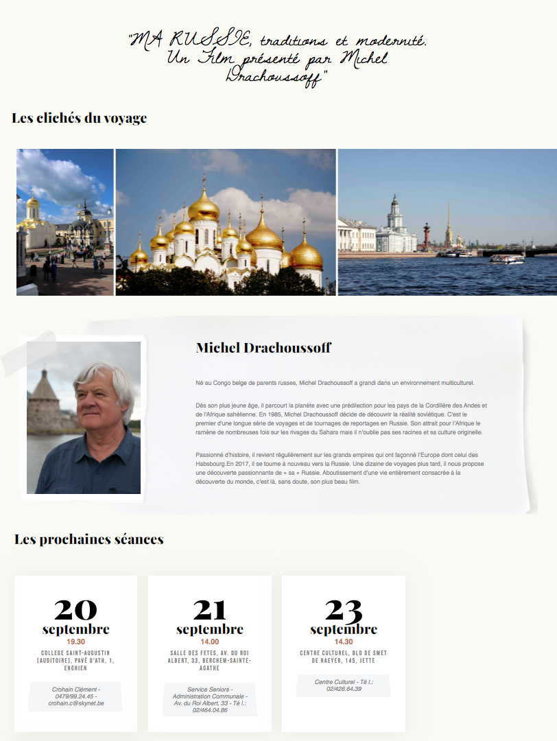 par Michel Drachoussoff Ami(e)s belges, Le site d'Exploration du Monde présente dès aujourd'hui l'agenda de toutes les séances de la saison 2021-2022, dont ma ciné-conférence sur "Ma Russie". Découvrez le calendrier ! Bonnes découvertes et beaux voyages autour du monde avec EXPLO dans les salles en Belgique et au Luxembourg! Quand aux Français(es), je vous communiquerai dès que possible le calendrier des dates des séances en France (avec Altaïr Conférences).