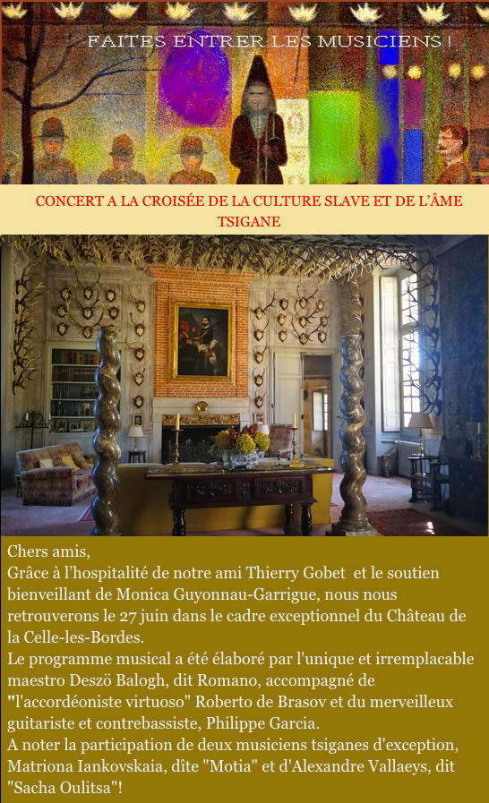 Chers amis, Grâce à l’hospitalité de notre ami Thierry Gobet et le soutien bienveillant de Monica Guyonnau-Garrigue, nous nous retrouverons le 27 juin dans le cadre exceptionnel du Château de la Celle-les-Bordes. Le programme musical a été élaboré par l'unique et irremplacable maestro Deszö Balogh, dit Romano, accompagné de "l'accordéoniste virtuoso" Roberto de Brasov et du merveilleux guitariste et contrebassiste, Philippe Garcia. A noter la participation de deux musiciens tsiganes d'exception, Matriona Iankovskaia, dîte "Motia" et d'Alexandre Vallaeys, dit "Sacha Oulitsa"!