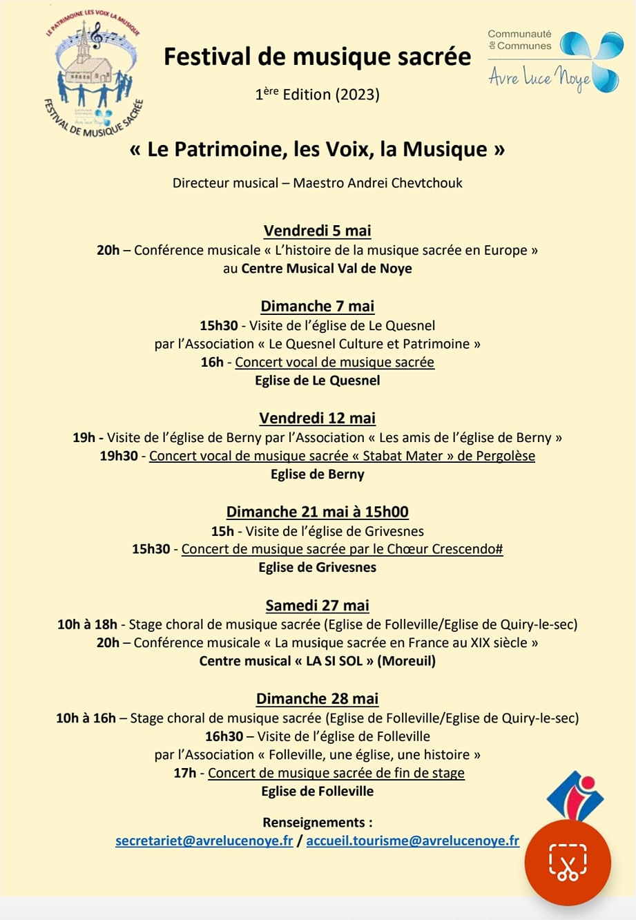Vendredi 5 mai 20h — Conférence musicale « L'histoire de la musique sacrée en Europe » au Centre Musical Val de Noye Dimanche 7 mai 15h30 - Visite de l'église de Le Quesnel par l'Association « Le Quesnel Culture et Patrimoine » 16h - Concert vocal de musique sacrée Eglise de Le Quesnel Vendredi 12 mai 19h - Visite de l'église de Berny par l'Association « Les amis de l'église de Berny 19h30 - Concert vocal de musique sacrée « Stabat Mater » de Pergolèse Eglise de Berny Dimanche 21 mai 15h - Visite de l'église de Grivesnes 15h30 - Concert de musique sacrée par le Choeur Crescendo# Eglise de Grivesnes Samedi 27 mai 10h à 18h - Stage choral de musique sacrée (Eglise de Folleville/Eglise de Quiry-le-sec) 20h — Conférence musicale « La musique sacrée en France au XIX siècle » Centre musical « LA SI SOL » (Moreuil) Dimanche 28 mai 10h à 16h — Stage choral de musique sacrée (Eglise de Folleville/Eglise de Quiry-le-sec) 16h30 — Visite de l'église de Folleville par l'Association « Folleville, une église, une histoire » 17h - Concert de musique sacrée de fin de stage Eglise de Folleville