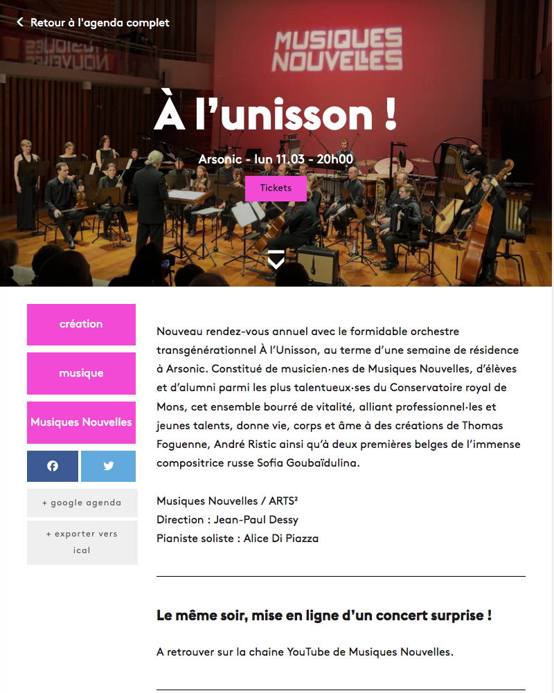 Musiques Nouvelles / Arts², direction : Jean-Paul Dessy, pianiste soliste : Alice Di Piazza Une coproduction Mars – Mons arts de la scène / Musiques Nouvelles, Arts². Nouveau rendez-vous annuel avec le formidable orchestre transgénérationnel À l’Unisson, au terme d’une semaine de résidence à Arsonic. Constitué de musicien·nes de Musiques Nouvelles, d’élèves et d’alumni parmi les plus talentueux·ses du Conservatoire royal de Mons, cet ensemble bourré de vitalité, alliant professionnel·les et jeunes talents, donne vie, corps et âme à des créations de Thomas Foguenne, André Ristic ainsi qu’à deux premières belges de l’immense compositrice russe Sofia Goubaïdulina.