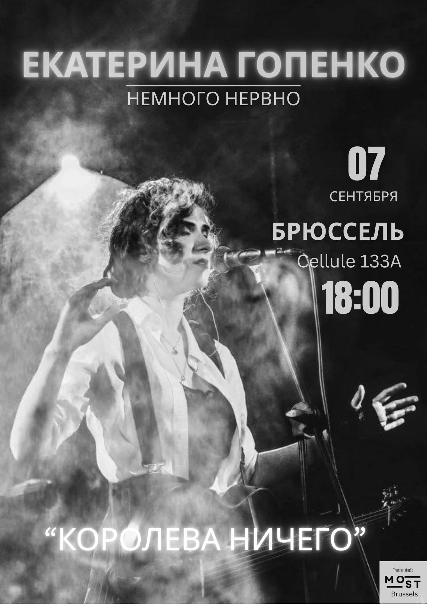 par Margarita Merethe,Театр-студия MOST Bruxelles “Королева ничего” – программа из песен и историй разных лет от Екатерины Гопенко, лидера дрим-фолк группы «Немного Нервно». Кроме песен, которые звучат так, будто она сочинила их о тебе, и смешных историй, которые могли бы произойти с каждым из нас, у « Островок привычной жизни », « слова, дающие надежду », « волшебство и спокойствие » - так отзываются слушатели о её выступлениях. « Это Борис Гребенщиков в юбке », - так отзываются тоже, но Екатерина об этом предпочитает не упоминать (да и на фото она не похожа). Почему вам нужно на этот концерт? Потому что именно на нём вы получите ответ на вопрос, как быть счастливым, когда у тебя ничего нет. Как властвовать над пустотой. Как находить себя заново после любой беды. Как быть королём и королевой без королевства. Но это не точно. Состав : Екатерина Гопенко – голос, гитара (дополняется) Екатерина Гопенко, лидер группы "Немного Нервно" - автор 14 пластинок, 3 моноспектаклей, 3 книг и 1 музыкального стенд-апа. Играла на радио BBC International, звучала на Нашем Радио, обладатель премии за добро в искусстве « На благо миру" »