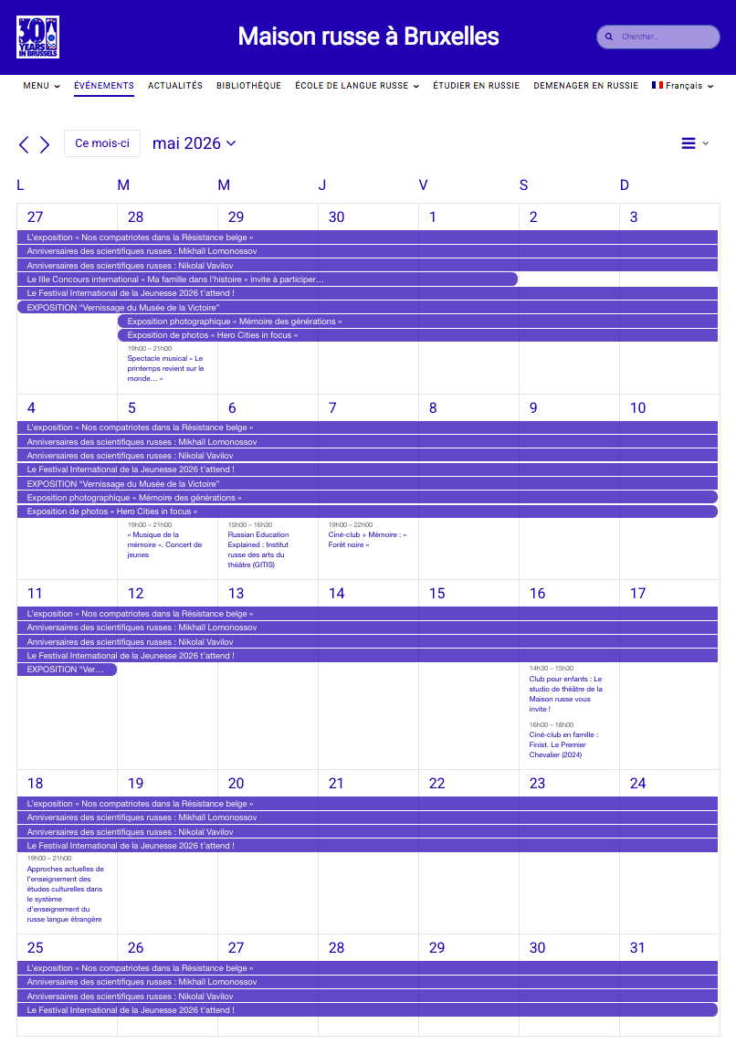 Maison russe Bruxelles-Europe. Calendrier des événements culturels du 1er au 31 mai 2026.