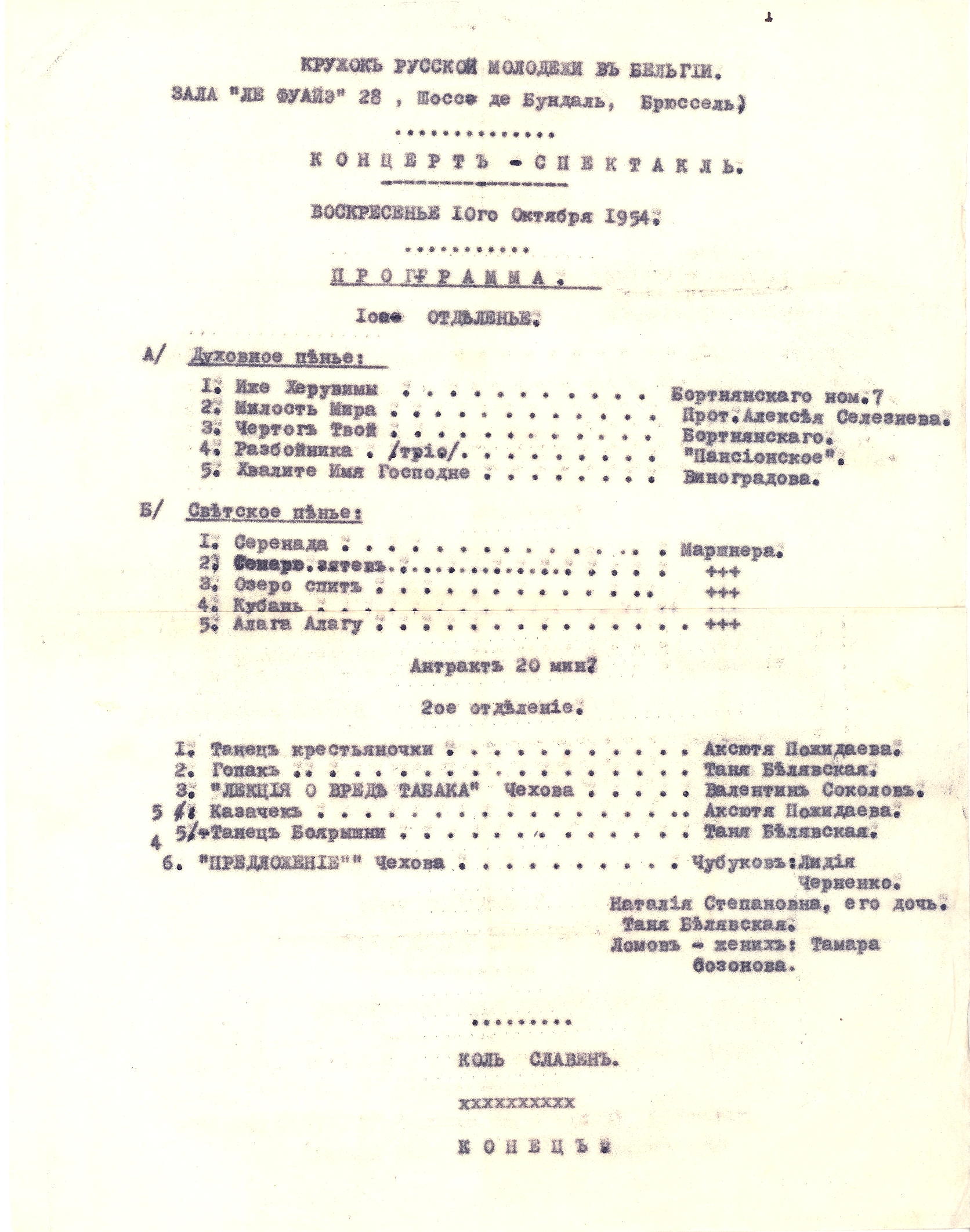 1. Танецъкрестьяночки . . . . . Аксюта Пожидаева. 2. Гопакъ . . . . . . . . . . . Таня Бѣлявская 3. "ЛЕКЦIЯ О ВРЕДЪ ТАБАКА" Чехова . . Валентинъ Соколовъ 4. Танецъ Боярышни . . . . . . . Таня Бѣлявская 5. Казачекъ . . . . . . . . . . Аксюта Пожидаева. 6. "ПРЕДЛОЖЕНIЕ" Чехова . . . . . Чубуковъ : Лидiя Черненко