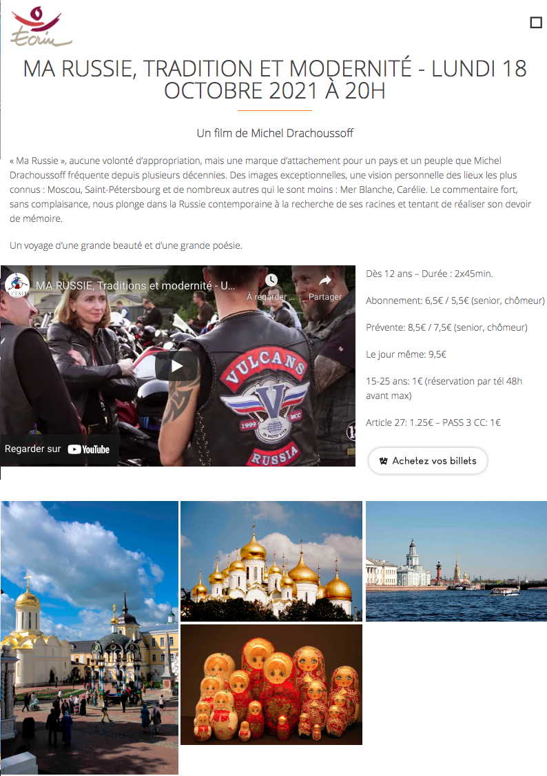 https://www.drachoussoff.com/ma-russie https://explorationdumonde.be/films/306-ma-russie-traditions-et-modernite Télécharger le dossier de presse : Communiqué de presse - RUSSIE - Michel Drachoussoff.doc Télécharger les photos du film (zip) : Ma Russie.zip