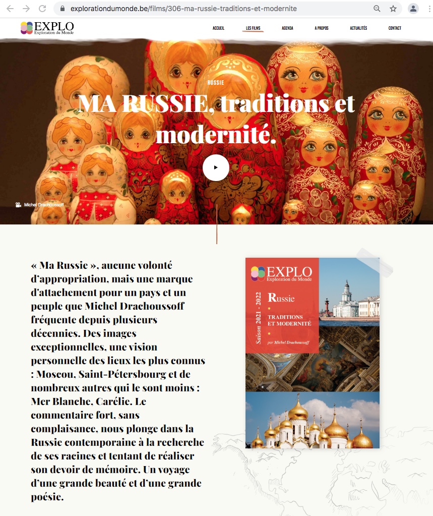 par Michel Drachoussoff Ami(e)s belges, Le site d'Exploration du Monde présente dès aujourd'hui l'agenda de toutes les séances de la saison 2021-2022, dont ma ciné-conférence sur "Ma Russie". Découvrez le calendrier ! Bonnes découvertes et beaux voyages autour du monde avec EXPLO dans les salles en Belgique et au Luxembourg! Quand aux Français(es), je vous communiquerai dès que possible le calendrier des dates des séances en France (avec Altaïr Conférences).