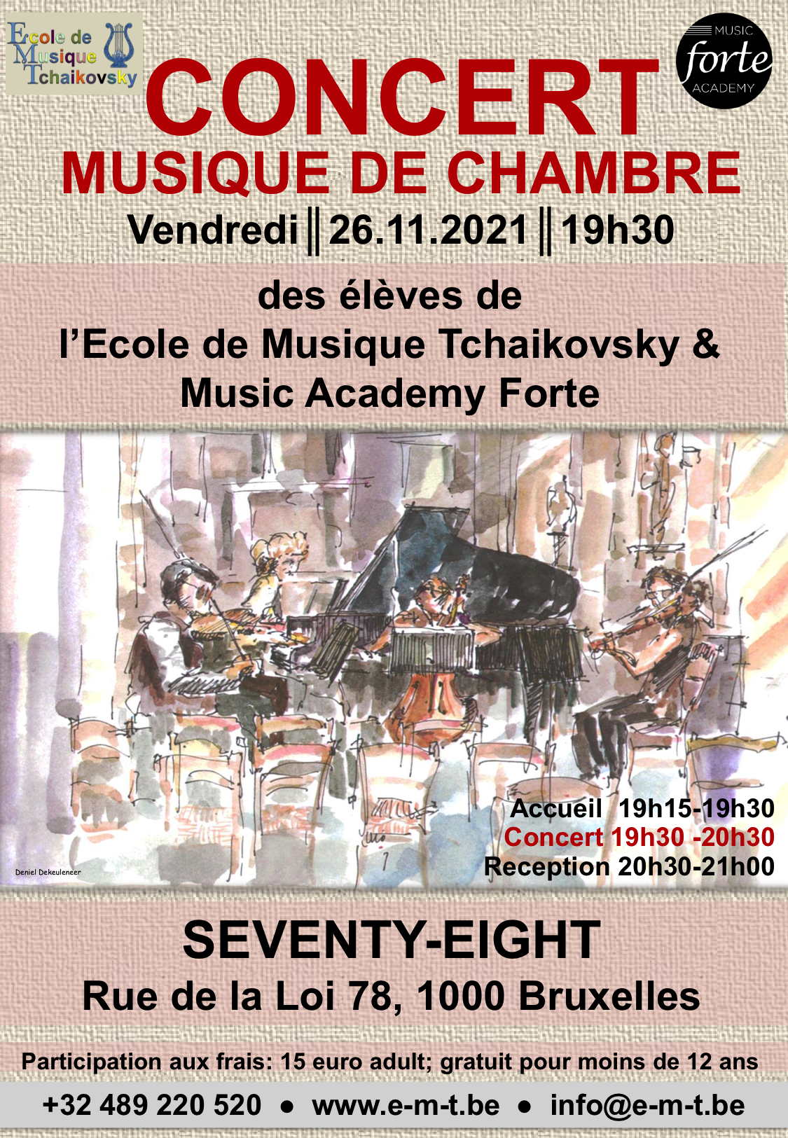 Bienvenue!!! (Sous conditions de règlement Covid). Participation aux frais : adulte 15 euros / moins de 12 ans gratuit Contact : 0489 22 05 20 / info at e-m-t.be Nataliya Chepurenko, Directrice Ecole de musique Tchaikovsky (ASBL) Adresse principale : 257, avenue G. Henri , 1200 WStL Bruxelles