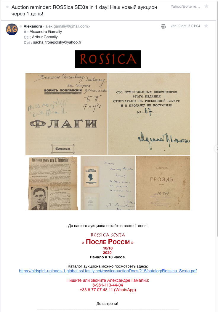 Каталогъ ROSSica SEXta. После Россiи : Поэзiя русской эмиграцiи, кпиги и обзоры. Après la Russie : la muse de l’exil. |  Наш новый аукцион через 1 день! Auction reminder: ROSSica SEXta in 1 day! |