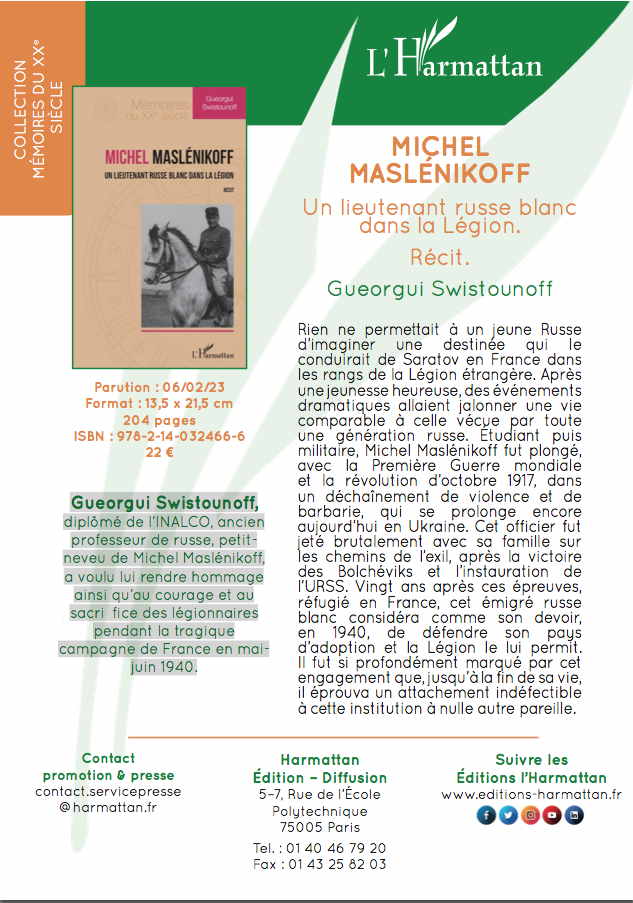Сайт/Site : https://www.editions-harmattan.fr/livre-michel_maslenikoff_un_lieutenant_russe_blanc_dans_la_legion_recit_gueorgui_swistounoff-9782140324666-76092.html