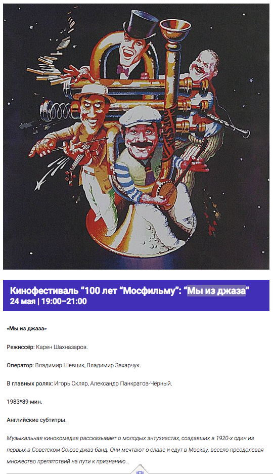 Сайт/Site : https://rushouse.be/event/film-festival-100-years-of-mosfilm-jazzman/